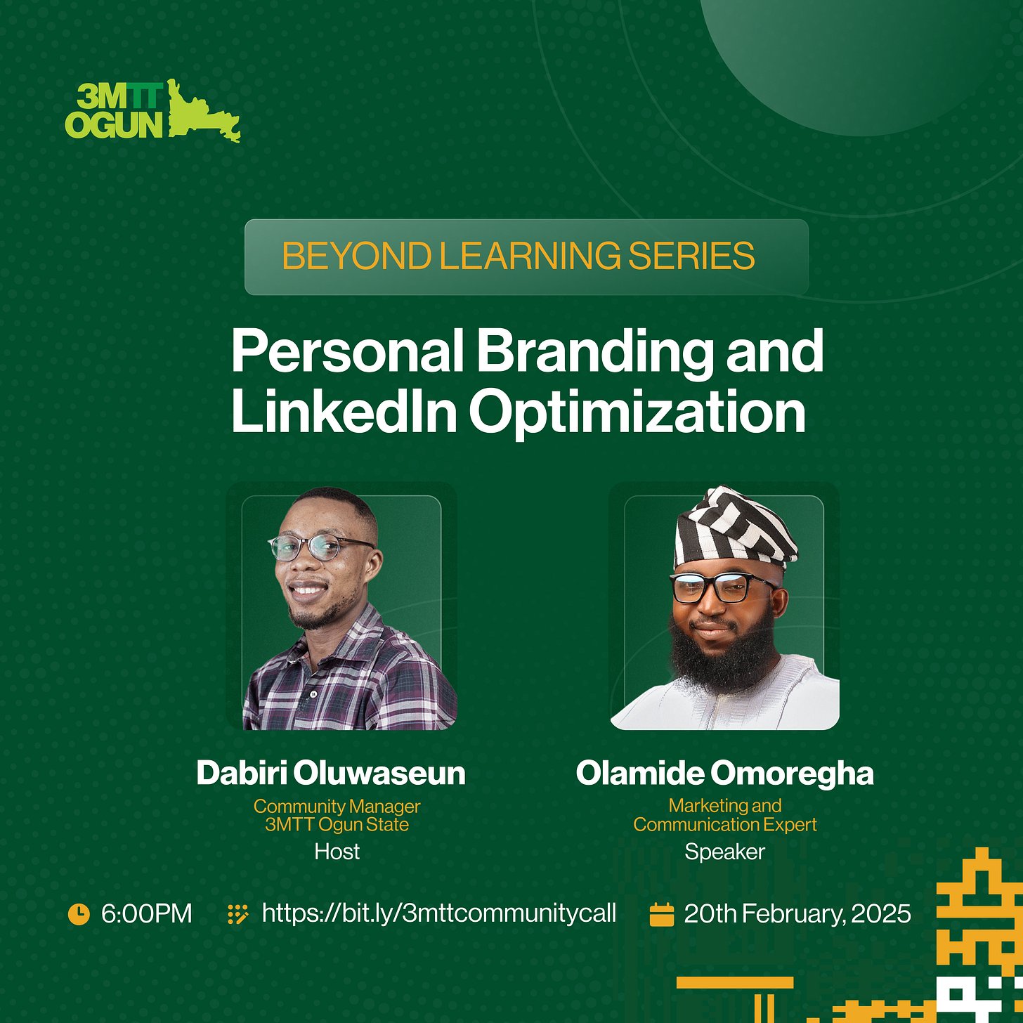 This session is designed to help you enhance your personal brand and optimize your LinkedIn profile for professional growth. Don’t miss this opportunity to learn from industry experts and connect with your fellow 3MTT Ogun State community members.
